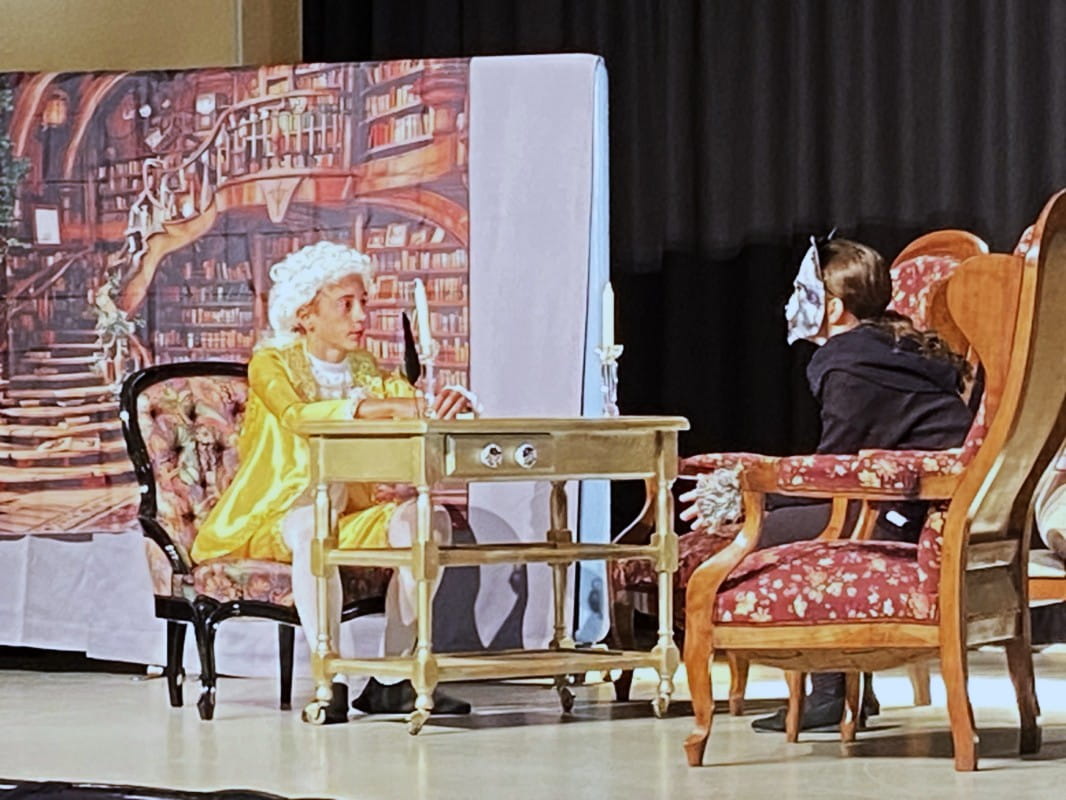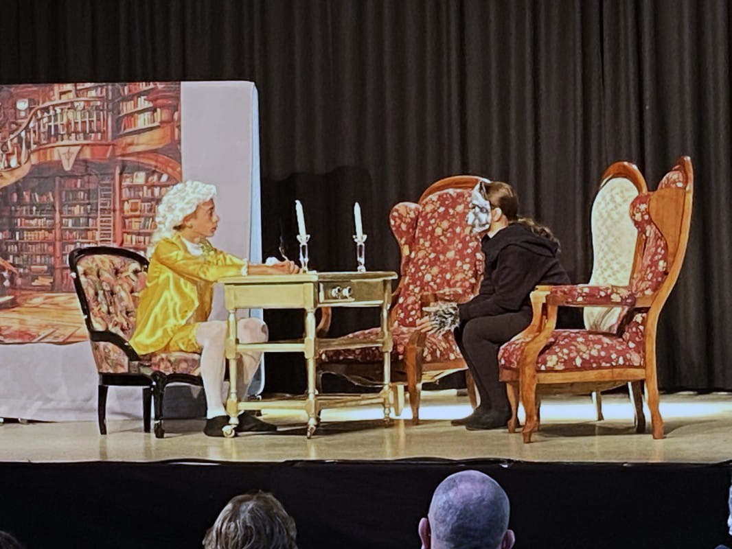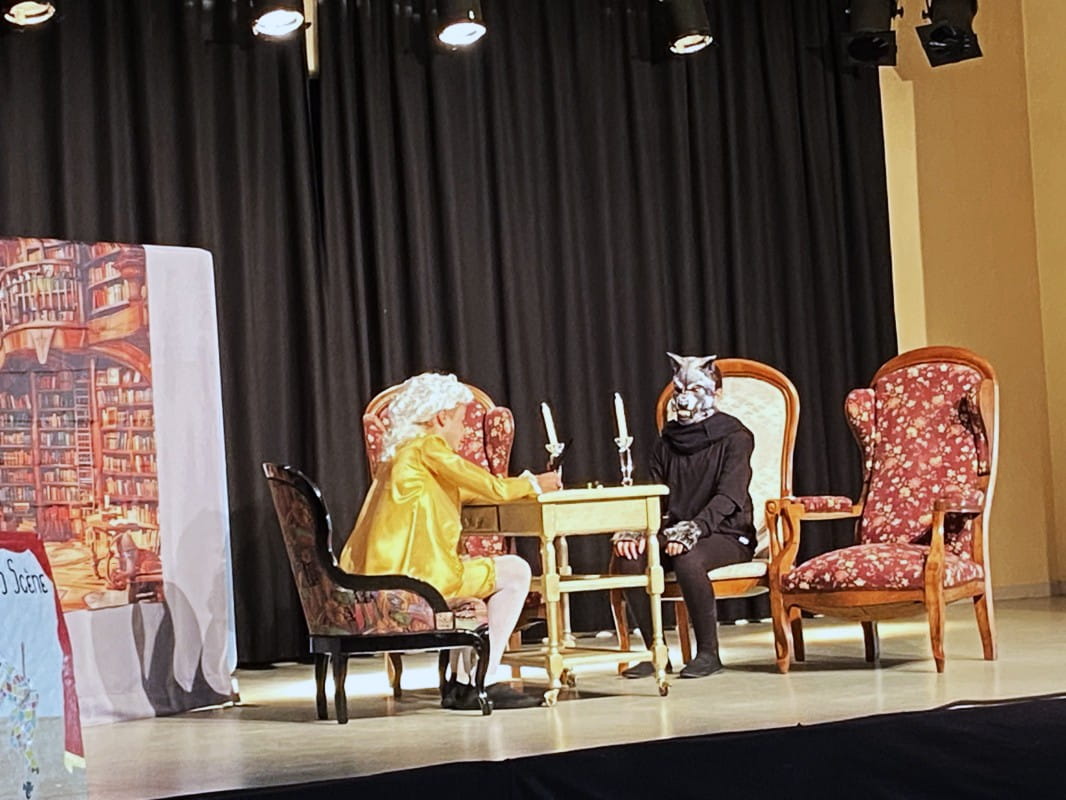 L’interprétation de la compagnie Arts’Banats Scène du conte de Charles Perrault, « Le petit Chaperon Rouge » : un loup recruté et un chaperon rouge drôle !!!! a été faite sur la scène de la Salle des Fêtes de Virelade.